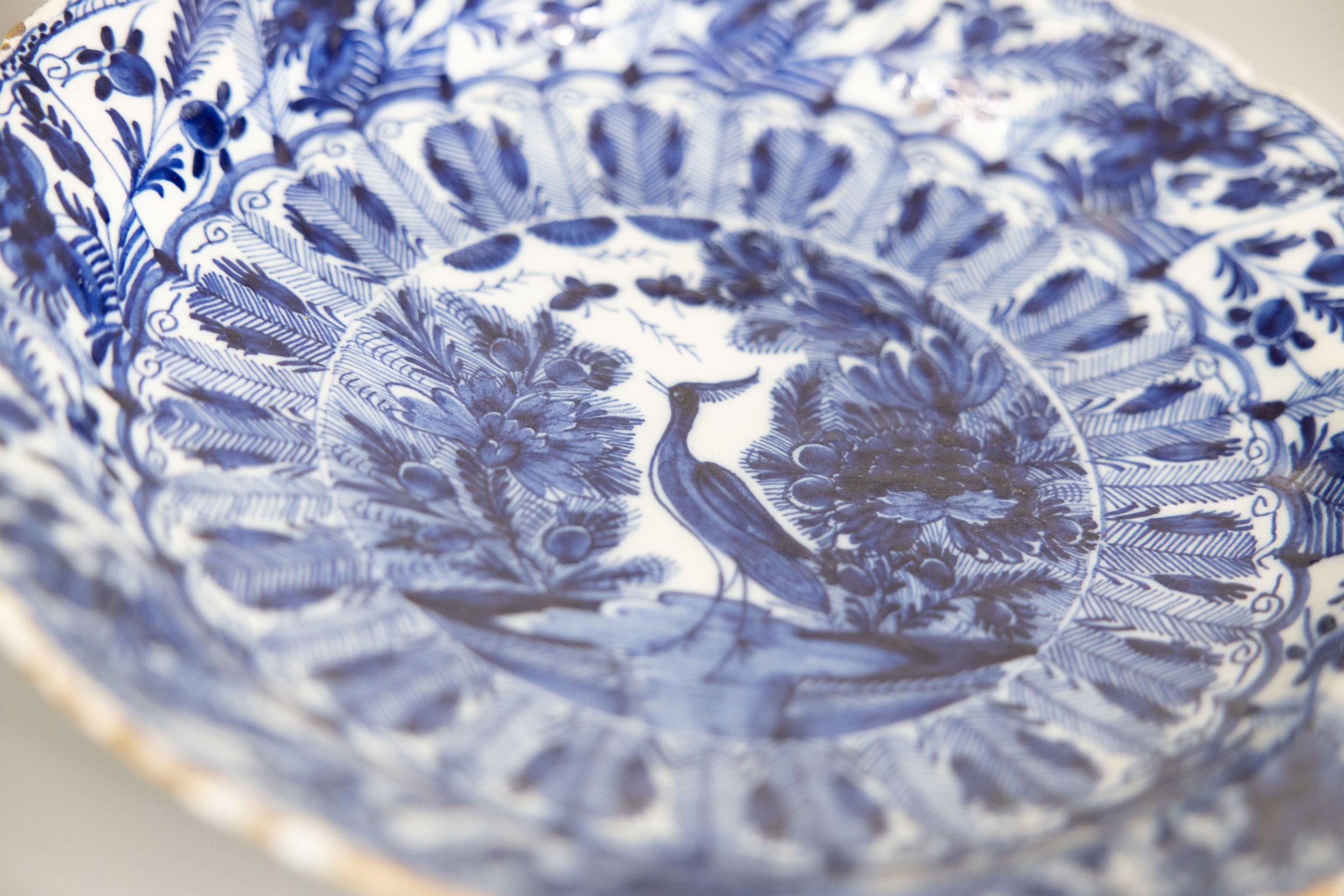Antique 18th Century Dutch Delft Faience Peacock Bird Scalloped Charger