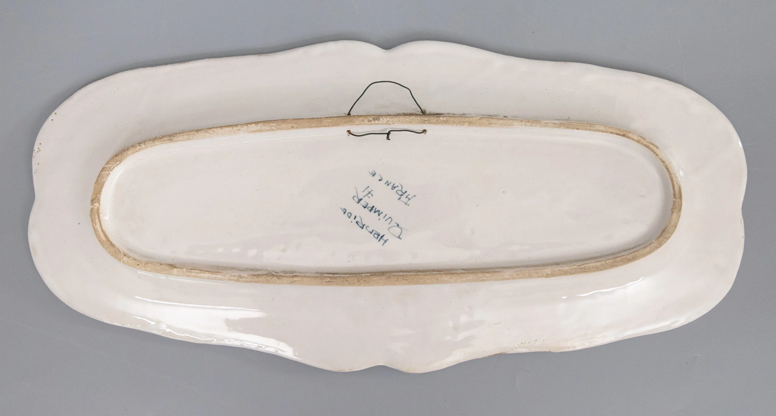 A charming antique French faience Quimper scalloped plate, circa 1920. Maker's mark on reverse. This lovely plate features a finely detailed hand painted sweet Breton couple in traditional costume dancing. The rim has a scalloped edge with curved panels framed in raised-relief, alternating with flower sprays and the Brittany crest. It displays beautifully and would be wonderful added to a collection.